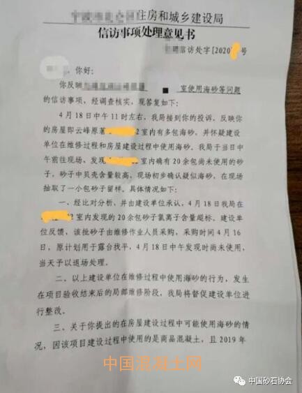 而對于業主所反映的2019年11月在施工現場發現海砂的問題,該住建局稱2019年下半年對小區局部混凝土進行取樣鑒定,氯離子含量符合要求,無證據表明房屋建設過程中使用了海砂。