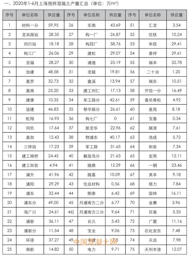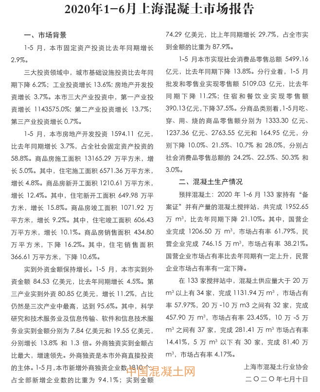 2020年1-6月上海混凝土市場報告