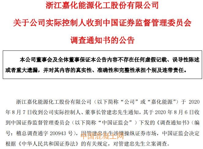 此前,嘉化能源實(shí)控人管建忠于2020年8月6日收到中國(guó)證監(jiān)會(huì)下發(fā)的《調(diào)查通知書(shū)》,因涉嫌操縱證券市場(chǎng)遭證監(jiān)會(huì)立案調(diào)查。