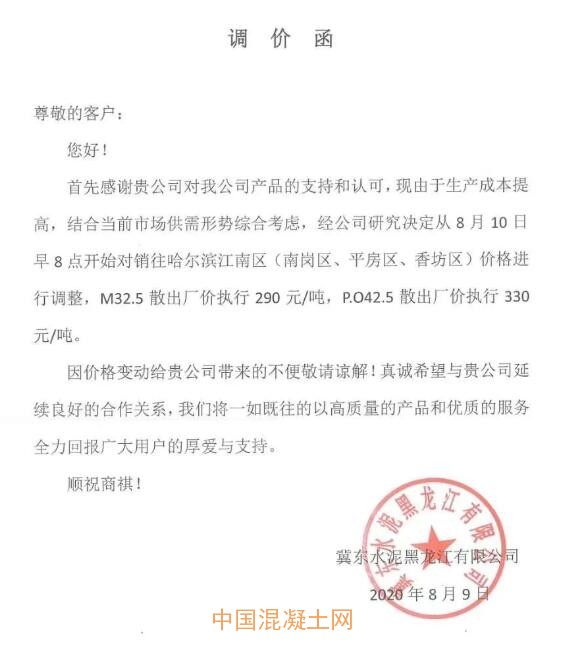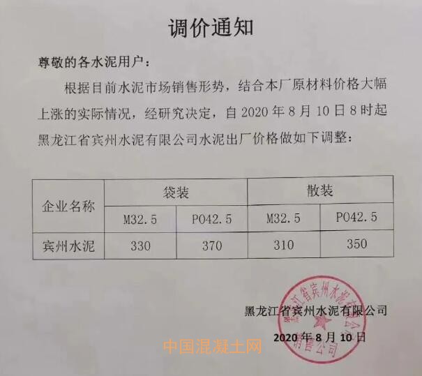 近日,哈爾濱市建筑業協會預拌混凝土(砂漿)分會發布調價通知。通知稱,目前哈爾濱市水泥價格大幅度上漲,本地水泥短時間內經過兩輪調價后暴漲100元,當地混凝土(砂漿)企業運營成本和資金壓力巨大!為保障混凝土質量,建議自2020年8月10日起,各種型號混凝土(砂漿)價格在原銷售價格基礎上每立方米上調30元!