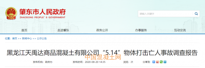 黑龍江省綏化市肇東市人民政府官網發布《黑龍江天禹達商品混凝土有限公司“5.14”物體打擊亡人事故調查報告》稱,2020年5月14日早4時10分左右,當地應急管理局接到報告稱肇東市天禹達小區院內建筑施工工地發生一起物體打擊事故,死亡一人,接到報告后,立即向肇東市政府和綏化市應急管理局報告。