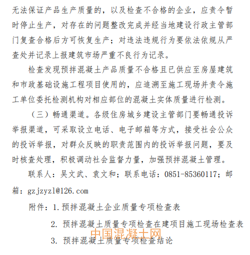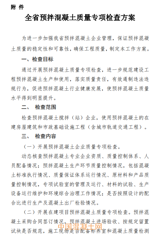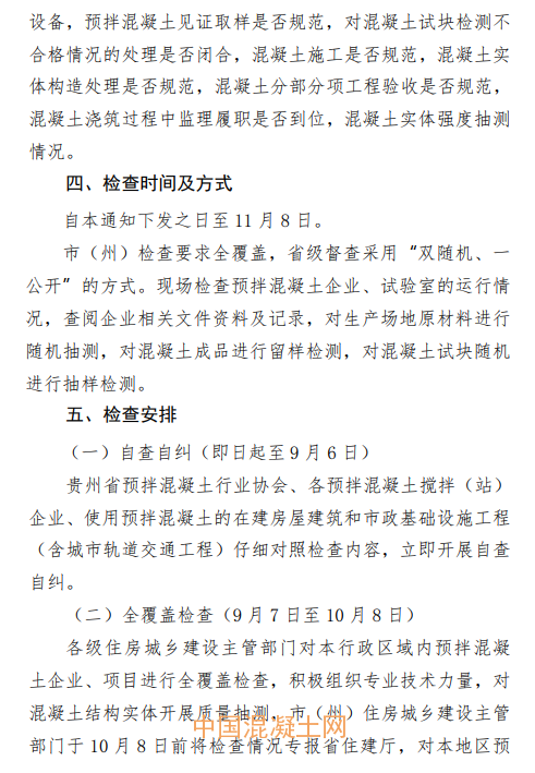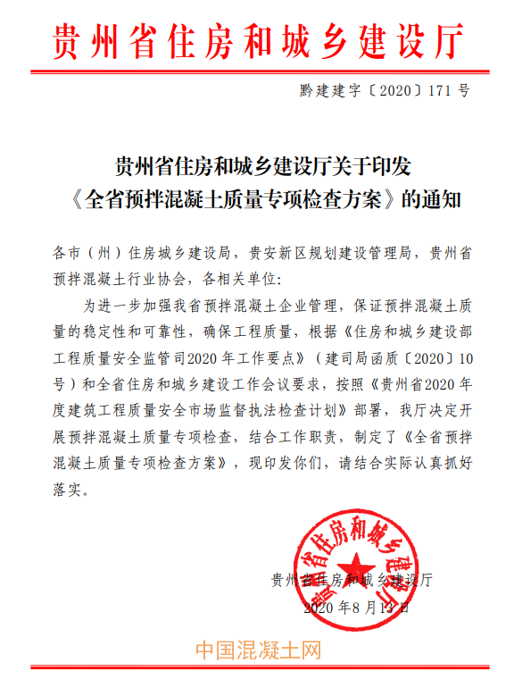 為進(jìn)一步加強(qiáng)貴州省預(yù)拌混凝土企業(yè)管理,保證預(yù)拌混凝土質(zhì)量的穩(wěn)定性和可靠性,確保工程質(zhì)量,8月13日,貴州省住房城鄉(xiāng)建設(shè)廳印發(fā)《全省預(yù)拌混凝土質(zhì)量專項(xiàng)檢查方案》的通知,要求自本通知下發(fā)之日至11月8日,在全省范圍內(nèi)開(kāi)展預(yù)拌混凝土質(zhì)量專項(xiàng)檢查。
