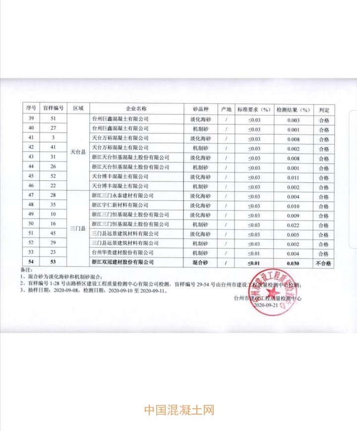 記者從浙江省臺州市住建局獲悉, 9月8號至9月11號,該局對全市預拌混凝土及管樁生產企業用砂氯離子含量進行了抽樣檢測,發現臺州市鼎鑫管樁有限公司的海砂、浙江雙冠建材股份有限公司的混合砂檢測結果為“不合格”。