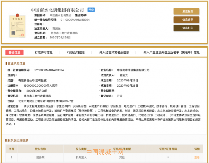 長安街知事查詢國家企業信用信息公示系統發現,中國南水北調集團有限公司于9月28日注冊成立,公司類型為有限責任公司(國有獨資),注冊資本為1500億元人民幣,唯一的股東是國務院。
