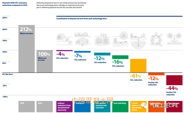 英國混凝土和水泥協會上周發布了2050年實現凈負排放(Net Negative Carbon Emissions)的路線圖[1][2],表示將會在2050年前實現大氣中減排多于其生產排放。路線圖發布的機構為英國混凝土協會(UK Concrete),是英國礦產協會(Mineral Products Association, MPA)的一部分。路線圖2050年的目標約等于實現每噸熟料生產實現負排放0.52噸CO2。