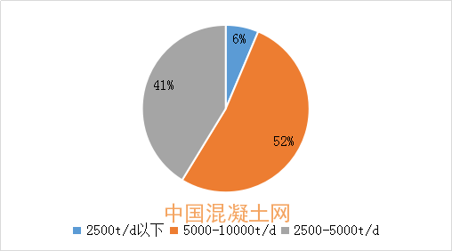 湖南省63條新型干法水泥熟料生產(chǎn)線設(shè)計(jì)產(chǎn)能7071萬噸(扣除了長期停產(chǎn)的),其中日產(chǎn)5000-10000噸線33條,占總產(chǎn)能52%;日產(chǎn)2500-5000噸26條,占總產(chǎn)能41%;日產(chǎn)2500t/d以下4條,占總產(chǎn)能6%。