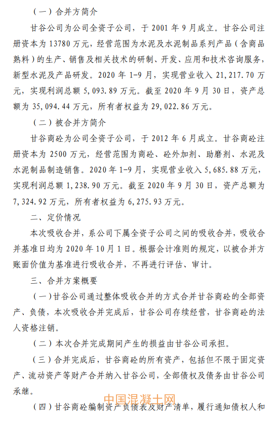 甘肅祁連山水泥集團股份有限公司(以下簡稱“公司”)董事會于 2020年10月28日召開第八屆董事會第二十次會議,審議通過了《關于公司下屬甘谷祁連山水泥有限公司吸收合并甘谷祁連山商砼有限公司的議案》,同意公司下屬甘谷公司吸收合并甘谷商砼,并將甘谷商砼進行注銷。本次吸收合并不構成關聯交易,亦不構成重大資產重組。該事項經公司董事會審議通過后尚需提交公司股東大會審議。
