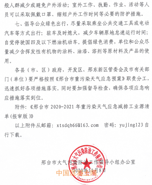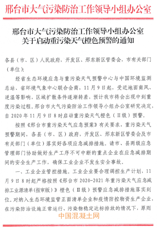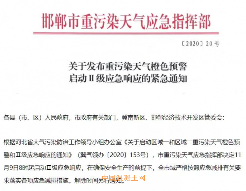 邯鄲市重污染天氣應急指揮部通知,于11月9日8時起啟動Ⅱ級應急響應,在確保安全生產的前提下,全市域嚴格按照應急減排有關要求落實各項應急減排措施。工業企業合理調控生產計劃,在確保安全生產和民生保障的前提下,按照《邯鄲市2020-2021年重污染天氣應急減排工業源清單(修訂版)》橙色預警(Ⅱ級)差異化減排措施執行到位。