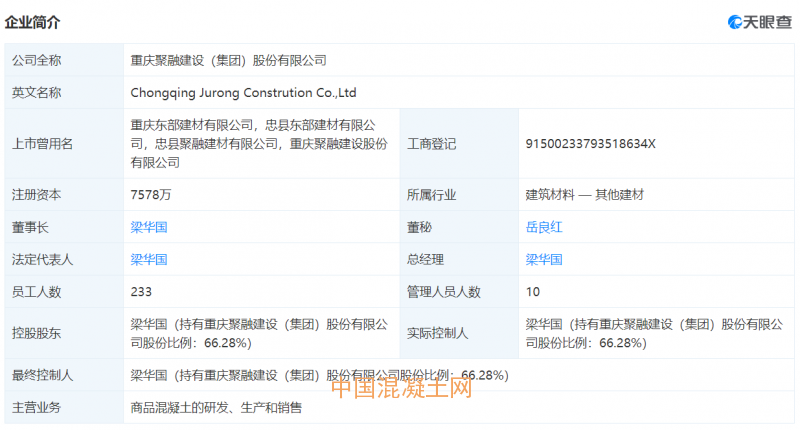 天眼查數(shù)據(jù)顯示,聚融建設(shè)成立于2007年12月3日成立,曾用名重慶東部建材有限公司,忠縣東部建材有限公司,忠縣聚融建材有限公司,2011年10月17日變更為股份有限公司,2014年8月6日在新三板掛牌,今年5月,從基礎(chǔ)層進入創(chuàng)新層,法定代表人(董事長兼總經(jīng)理)梁華國,主營業(yè)務(wù)商品混凝土的研發(fā)、生產(chǎn)和銷售,注冊資本7578萬元,