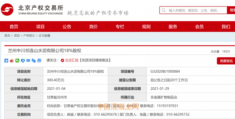 1月4日,從北京產權交易所獲悉,甘肅祁連山水泥集團股份有限公司掛牌蘭州中川祁連山水泥有限公司(以下簡稱“中川祁連山水泥”)18%股權,轉讓底價為300.4萬元,交易保證金90萬元。信息披露起止日為2021年1月4日至2021年1月29日。