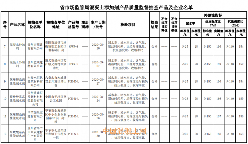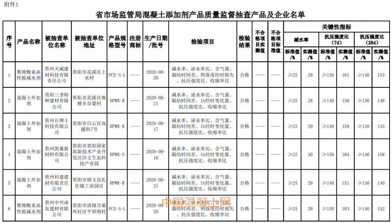 2020年12月31日,貴州省市場(chǎng)監(jiān)督管理局網(wǎng)站發(fā)布關(guān)于2020年度混凝土添加劑等29種產(chǎn)品質(zhì)量監(jiān)督抽查情況的公告。據(jù)公告,本次對(duì)15家企業(yè)生產(chǎn)的15批次混凝土添加劑產(chǎn)品質(zhì)量開(kāi)展了監(jiān)督抽查,涉及貴州省貴陽(yáng)市、遵義市、六盤(pán)水市、安順市、畢節(jié)市、黔東南州、黔南州等7個(gè)市(州)。依據(jù)GB 8076-2008《混凝土外加劑》、JG/T 223-2007《聚羧酸系高性能減水劑》等標(biāo)準(zhǔn)要求進(jìn)行檢驗(yàn)。經(jīng)檢驗(yàn),未發(fā)現(xiàn)不合格產(chǎn)品。