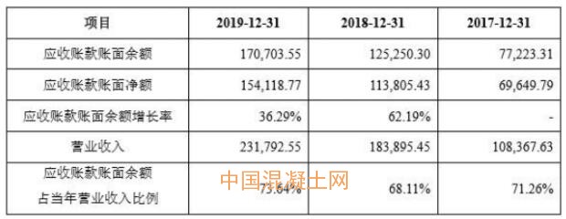 與之相對應(yīng)的,港創(chuàng)建材大部分盈利以應(yīng)收賬款的形式存在,據(jù)招股書顯示,2017年-2019年,公司應(yīng)收賬款賬面余額分別為7.72億元、12.52億元、17.07億元,逐年大幅增長,占公司營收比重分別為73.64%、68.11%、71.26%。