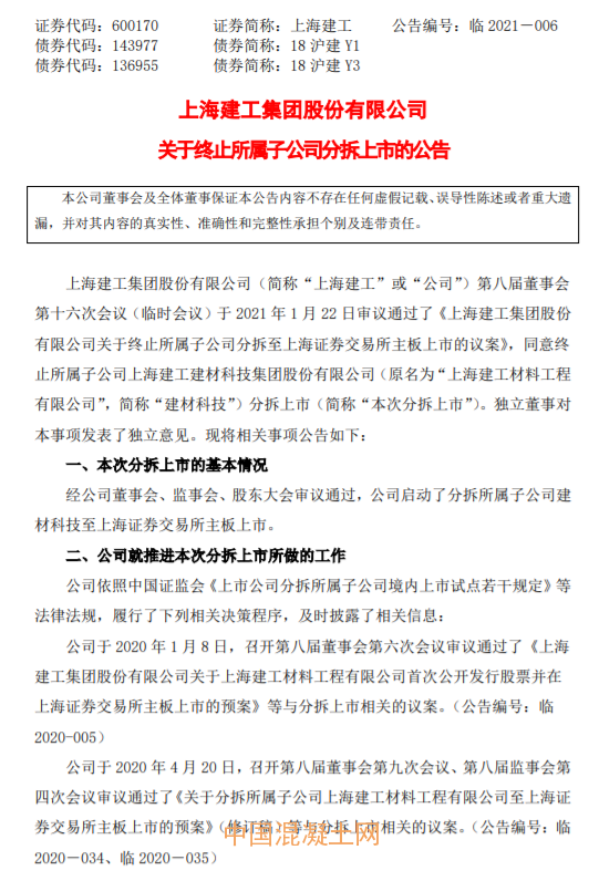 上海建工(600170)1月22日晚間公告,公司此前啟動了分拆所屬子公司建材科技至上交所主板上市。公司擬調整建材工業板塊戰略規劃,加大在建筑建材領域的研發投入,拓展數字化技術在綠色建筑工業中的應用,逐步提升建材科技對新技術、新產品與傳統產業的融合能力,增強其價值創造能力,未來另行籌劃其上市方案。因此,公司擬終止建材科技分拆上市方案,并撤回相關上市申請。