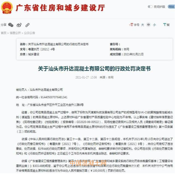 據廣東省住房和城鄉建設廳官網于2021年01月27日公布的《關于汕頭市升達混凝土有限公司的行政處罰決定書》顯示:汕頭市升達混凝土有限公司在商品混凝土生產過程中,使用了標稱為天津某科技發展有限公司生產的規格型號為VK-CS的聚羧酸高性能減水劑(緩凝型)的商品混凝土原材料。上述原材料經廣東省建材產品質量檢驗中心檢驗為不合格。違反了《廣東省建設工程質量管理條例》第十四條第(三)項的規定。