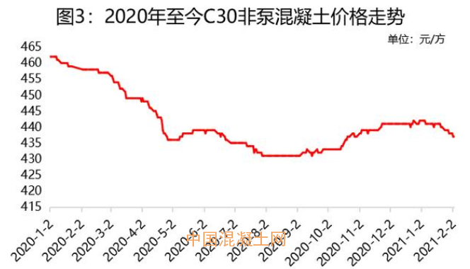 截至2021年2月3日,全國C30非泵均價為437元/方,同比下跌5%。2020年初各地復工復產緩慢,導致混凝土市場價格持續下跌。5月以后需求開始回升,混凝土市場價格呈現小幅上行趨勢,但是三季度國內洪澇災害嚴重,混凝土價格保持低位狀態,8月份達到全年最低水平,均價維持在430元/方。三季度以后各地加緊趕工期,對于混凝土需求具有較大支撐,原材價格不斷上升。在成本與需求的雙重提升下,混凝土價格再顯漲勢;2021年1月開始,隨著需求逐步減少,混凝土價格開始下跌。近期華南區域海口、三亞、儋州、深圳等地混凝土價格下跌10元/方。華北北京、天津、邢臺。西安等待價格下跌20元/方左右。其他部分地區價格均有小幅走低趨勢。