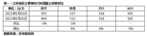 從表一可以看出,本月江蘇地區(qū)重點城市混凝土價格整體仍以弱勢運行為主,南京、南通地區(qū)混凝土價格環(huán)比略有下降,同比除南京地區(qū)混凝土價格持平以外,南通及徐州地區(qū)混凝土價格有不同程度下跌,最高跌幅5%;蘇州地區(qū)混凝土價格同比略有上漲,漲幅達6%。截止2021年2月20日,江蘇地區(qū)P.042.5散裝水泥價格市場均價477.5元/噸,同比下降6.4% 水泥價格從2月16日開始陸續(xù)下調(diào),其中蘇南地區(qū)低標號散裝價格下調(diào)30元/噸,高標號水泥價格持穩(wěn)運行;蘇北地區(qū)部分高標號水泥價格下調(diào)40元/噸。原材料價格波動的情況下,混凝土價格仍以弱勢持穩(wěn)為主,未出現(xiàn)普遍性調(diào)價。節(jié)后市場需求尚未恢復,商混價格持穩(wěn)過度,正月十五后混凝土企業(yè)全面復工復產(chǎn)之后,為提高攪拌站出貨量,混凝土價格或?qū)⒊霈F(xiàn)下調(diào)。