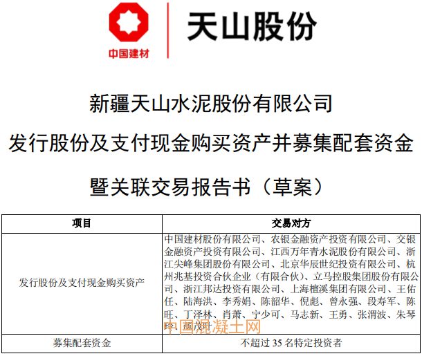 據天山股份(000877.SZ)3月2日晚間披露,公司計劃采用發行股份及支付現金的方式,向中國建材等26名交易對方購買中聯水泥100%股權、南方水泥99.9274%股權、西南水泥95.7166%股權及中材水泥100%股權等資產。