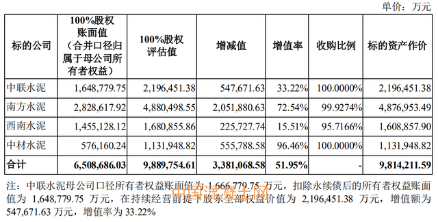 根據評估結果,天山股份需要支付的資產總對價為981.42億元,具體為,中聯水泥標的資產作價219.6億元,南方水泥標的資產作價487.7億元,西南水泥標的資產作價160.89億元,中材水泥標的資產作價113.2億元。據公告,941.71億元對價由上市公司以發行股份的形式支付,39.71億元對價以現金形式支付。經協商,天山股份本次發行股份的價格為13.38元/股,發行股票數量合計為70.38億股。此外,支付現金的交易對方包括持有南方水泥2.30086%股權的交銀投資、持有西南水泥3.58295%股權及南方水泥4.60172%股權的農銀投資。