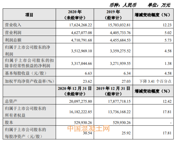 根據報告,2020年度,公司實現營收1762.43億元,較上年同期增長12.23%;營業利潤462.71億元,較上年同期增長5.02%;利潤總額471.08億元,較上年同期增長5.73%;凈利潤351.3億元,較上年同期增長4.57%;扣非凈利潤331.7億元,較上年同期增長1.38%;基本每股收益6.63元,較上年同期增長0.29元/股。截至2020年12月31日,公司總資產2009.73億元,較上年末增長12.42%;所有者權益1618.22億元,較上年末增長17.81%;每股凈資產30.54元,較上年末增長4.62元/股。
