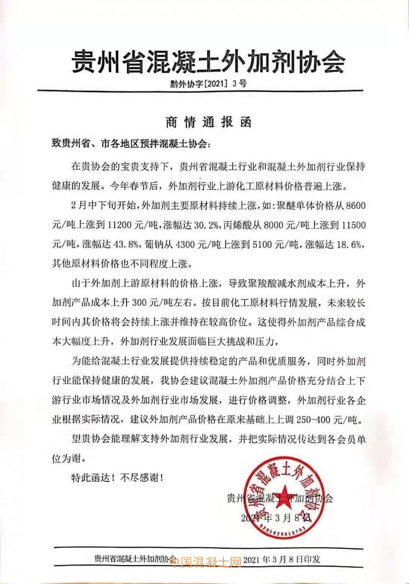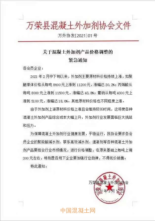 在此倡議:外加劑企業及時關注原料市場動態,積極組織貨源,力保產品供應;下游混凝土企業和工程建設單位理解原料價格變動給外加劑企業帶來的成本增加,及時調整外加劑采購價格。讓我們攜手共渡難關!