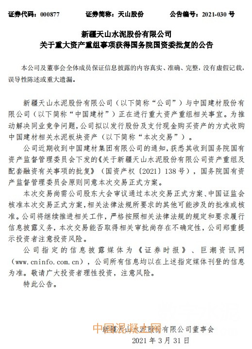 公司近期收到中國建材的通知,獲悉其收到國務院國資委下發(fā)的《關于新疆天山水泥股份有限公司資產(chǎn)重組及配套融資有關事項的批復》,國務院國資委原則同意本次交易正式方案。