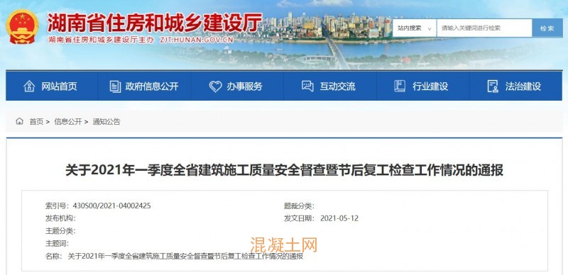 今年3月中旬至4月初,湖南省住房和城鄉建設廳開展了全省建筑施工質量安全督查暨節后復工檢查。5月12日,“關于2021年一季度全省建筑施工質量安全督查暨節后復工檢查工作情況的通報”公布。