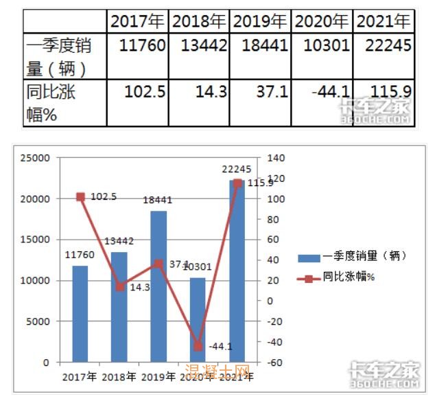 根據終端上牌數據顯示,2021年一季度我國攪拌車(主要是重型,下同)銷量為22245輛,同比去年一季度的10301輛大漲近116%,跑贏一季度重卡市場大盤(一季度重卡同比漲幅93.2%),為今年一季度重卡市場的大漲起到了添磚加瓦的作用。那么,今年一季度攪拌車市場憑啥能賣得這樣火?到底有啥特點?現在與砼友們來聊一聊這方面的話題。