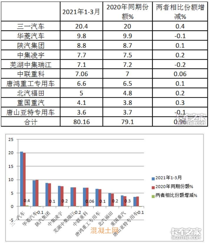 上圖表可見,在2021年一季度與2020年同期的攪拌車市場的競爭格局中,前10名主流企業競爭特征:
