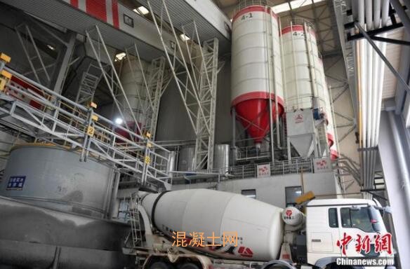 圖為雄安新區(qū)容西混凝土攪拌站現(xiàn)場混凝土罐車正在作業(yè)