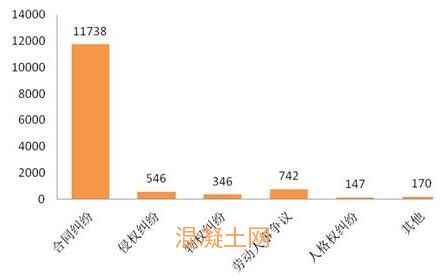 從案由分類情況可以看到,混凝土行業當前最主要的案由是合同糾紛,其次是侵權糾紛,無權糾紛,勞動人事糾紛等。勞動爭議因為有仲裁前置程序,考慮到仲裁、調解結案等分流,可能案件數量有低估的可能。