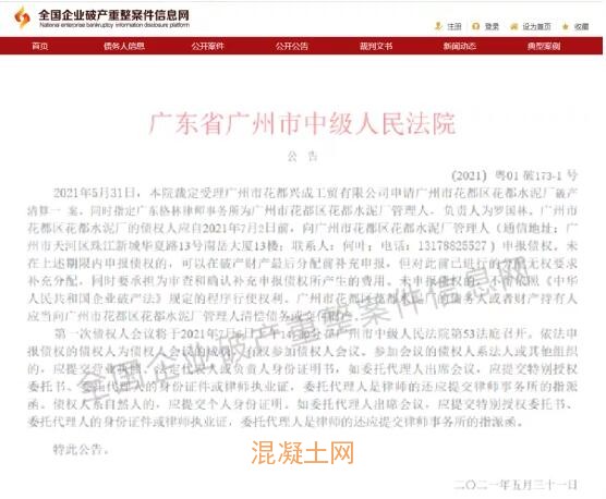 廣州市法院系統(tǒng)公告曾發(fā)布《裁定受理廣州市花都興成工貿(mào)有限公司申請(qǐng)廣州市花都區(qū)花都水泥廠破產(chǎn)清算一案》公告。公告文件提到廣州市法院裁定受理廣州市花都興成工貿(mào)有限公司申請(qǐng)申請(qǐng)廣州市花都區(qū)花都水泥廠破產(chǎn)清算一案,同時(shí)指定廣東格林律師事務(wù)所為廣州市花都區(qū)花都水泥廠管理人,負(fù)責(zé)人為羅國(guó)林。廣州市花都區(qū)花都水泥廠的債權(quán)人應(yīng)自2021年7月2日前,向廣州市花都區(qū)花都水泥廠管理人申報(bào)債權(quán)。