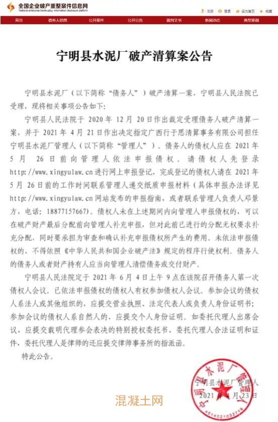 寧明縣水泥廠破產(chǎn)清算案公告提到,寧明縣水泥廠破產(chǎn)清算一案,寧明縣人民法院已受理。寧明縣人民法院于2020年12月20日作出裁定受理債務(wù)人破產(chǎn)清算一案,并于2021年4月21日作出決定指定廣西行于思清算事務(wù)有限公司擔(dān)任寧明縣水泥廠管理人。
