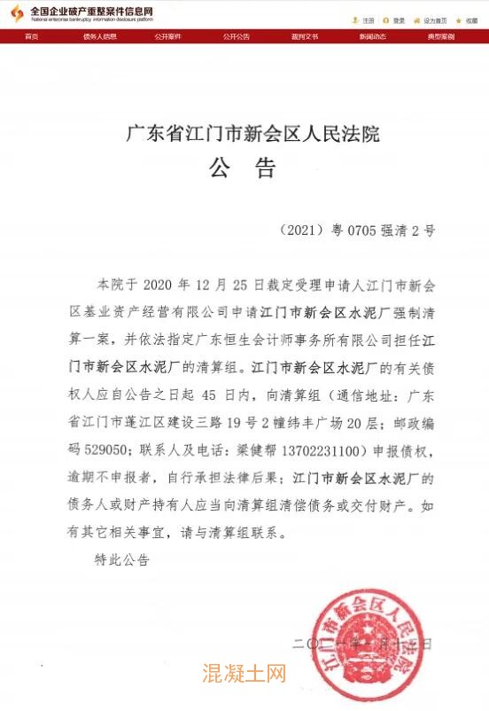 全國(guó)企業(yè)破產(chǎn)重整案件信息網(wǎng)2021年內(nèi)公布的內(nèi)容中也有提到多家水泥企業(yè)破產(chǎn)清算事宜。