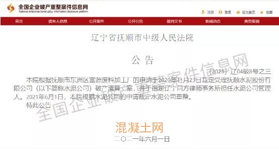 遼寧扶省撫順市中級(jí)人民法院公司,于2020年11月23日裁定受理?yè)犴標(biāo)喙煞萦邢薰酒飘a(chǎn)清算一案,并指定遼寧同方律師事務(wù)所擔(dān)任水泥公司管理人。