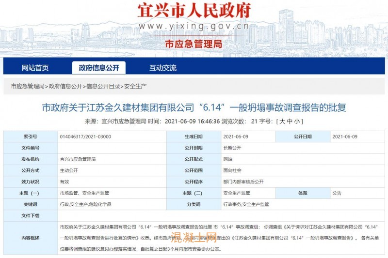 2021年6月9日,江蘇省宜興市人民政府官網發布《關于江蘇金久建材集團有限公司“6.14”一般坍塌事故調查報告的批復》,對一起因筒庫坍塌造成2死1傷的事故進行通報。