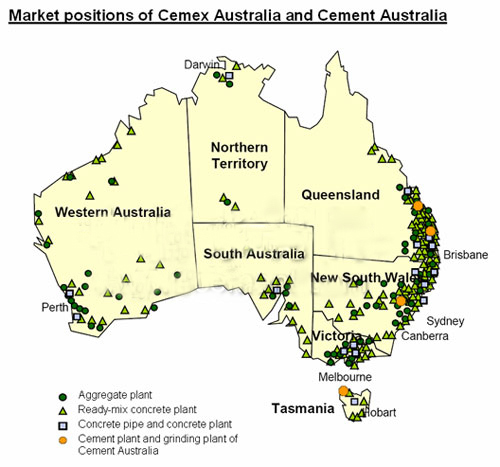 據(jù)悉,Cemex在澳大利亞的業(yè)務(wù)包括骨料,預(yù)拌混凝土和混凝土制品。共有83個(gè)骨料生產(chǎn)基地,骨料存儲(chǔ)量達(dá)10億噸,249個(gè)預(yù)拌混凝土攪拌站和16個(gè)水泥管和水泥制品廠。其2008年銷(xiāo)售額約為18.6億澳元,息稅折舊攤銷(xiāo)前利潤(rùn)額約為3.13億澳元,共有雇員2800人。Cemex澳大利亞還持有澳大利亞水泥公司(Cement Australia)25%的股份,而Holcim在澳大利亞水泥所占股份為50%。