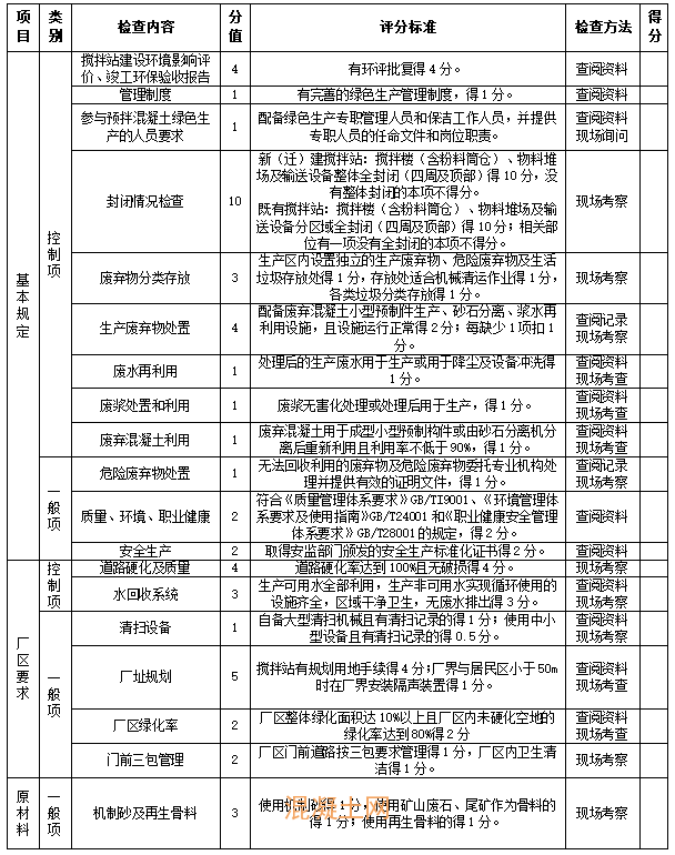 3.0.6本市范圍內既有混凝土攪拌站儲料區、攪拌樓、物料輸送系統應分區域或整體全封閉,道路及生產區域地面應全部硬化,并應按照本導則中評分表要求進行升級改造,改造后按附錄A評分表檢查得分不應低于85分且控制項不應扣分。