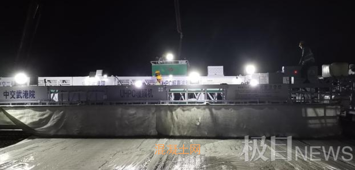 在施工現場,記者看到,超高性能混凝土布料攤鋪及整平由布料、整平及養護一體機完成:現場澆筑采用泵車將UHPC泵送入布料機進行攤鋪作業,振搗整平機對UHPC層收面、整平,UHPC層澆筑后立即覆蓋薄膜、土工布養護……整個施工自動化程度高、平整度控制精度高、且大大節省了人工。