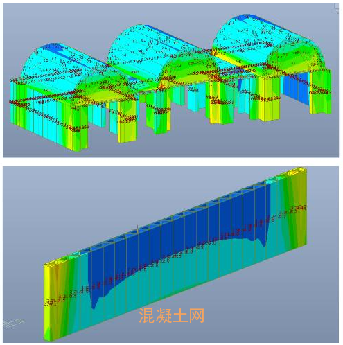建筑結構安全是3D打印這一新的建造方法的重要內容,在這一項目中,結構工程師采用了Midas軟件對三維形體模型進行整體計算和分析,首先根據節材的要求,將拱形屋頂及墻體設計成帶truss的空心墻,結合3D打印設備前端材料出口的尺寸,分別對拱和墻等構件的truss排布進行深入分析與比較,從而確定構件的最終尺寸;接著將確定的構件實際尺寸反饋到整體模型上,對其進行構件內力分析;最后進行施工吊裝分析,確定合理的施工吊裝方案。結構的設計過程與建筑形體建模能夠緊密配合,是因為參數化數字模型為實現建筑與結構專業之間的數字信息交流提供了流暢的途徑。此外,為確保結構的可靠性,分別對重要構件如墻、拱頂、平屋頂分別進行了構件破壞試驗,并對該農宅整體結構進行了縮尺的振動臺試驗,從而驗證了該3D打印混凝土建筑項目的安全性。