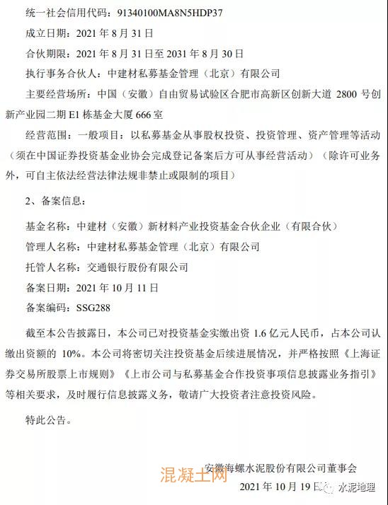 根據(jù)披露,2021年7月16日,經(jīng)海螺水泥董事會(huì)審議通過,同意公司作為有限合伙人,認(rèn)繳出資16億元人民幣,與中建材私募基金管理(北京)有限公司及其他有限合伙人共同出資設(shè)立中建材(安徽)新材料產(chǎn)業(yè)投資基金(有限合伙)(暫定名,最終以企業(yè)登記機(jī)關(guān)核準(zhǔn)名稱為準(zhǔn))。(相關(guān)鏈接:重磅! 中國(guó)建材, 海螺, 上峰等聯(lián)合成立新公司! 出資200億!)具體《公告》如下:
