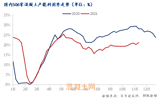 截至11月17日,我們跟蹤國內(nèi)混凝土企業(yè)出貨情況,本周(11月10日-11月17日)國內(nèi)500余家混凝土出貨量有所回升,統(tǒng)計(jì)期內(nèi),混凝土平均產(chǎn)能利用率為21.24%,較上一周期(11月3日-11月10日)提升0.96%,較去年同期低6.89個(gè)百分點(diǎn)。調(diào)研期內(nèi)部分地區(qū)水泥等材料價(jià)格有所降溫,但整體來看仍處于高位,且部分地區(qū)出現(xiàn)年底趕工情況,施工進(jìn)度加快,采購量較之前有所回升;但整體來看,大部分地區(qū)新開工項(xiàng)目較少,下游需求遲遲未能發(fā)力,多數(shù)混凝土企業(yè)目前還是回款為主,全國混凝土需求不及去年同期。