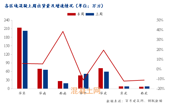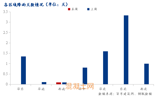 根據(jù)當(dāng)周影響混凝土產(chǎn)量的降雨天數(shù)來看,本周影響混凝土出貨量的平均降雨天數(shù)不到1天。各地區(qū)近期均沒有受到雨水天氣影響,攪拌站出貨情況本周與天氣因素關(guān)聯(lián)性較小。后期隨著新一輪全國性冷空氣再“上線”,部分地區(qū)或會(huì)受到雨雪天氣影響,屆時(shí)出貨量或有明顯降低。