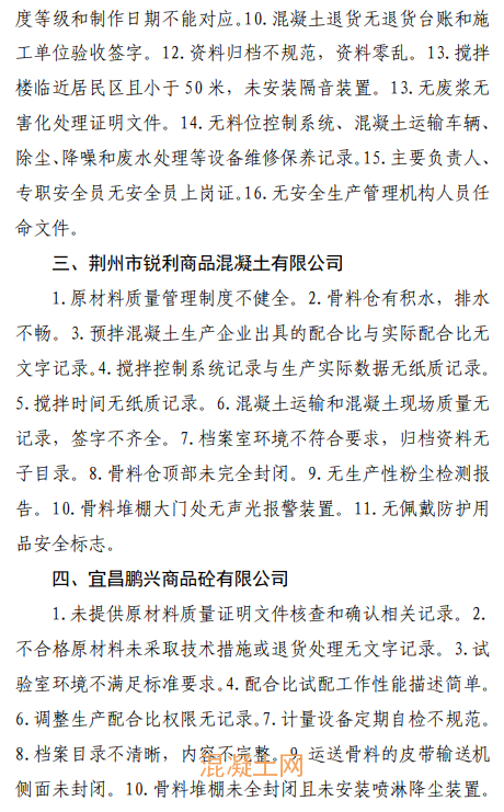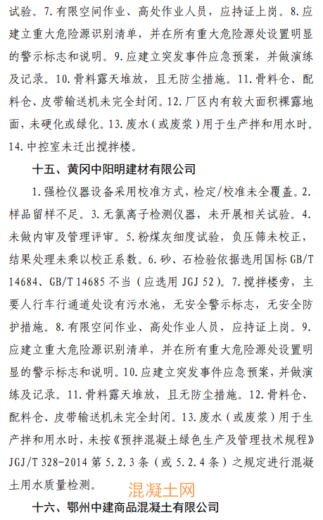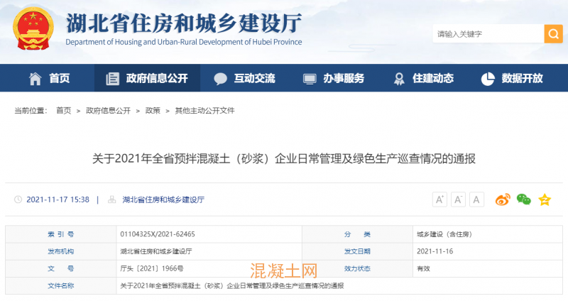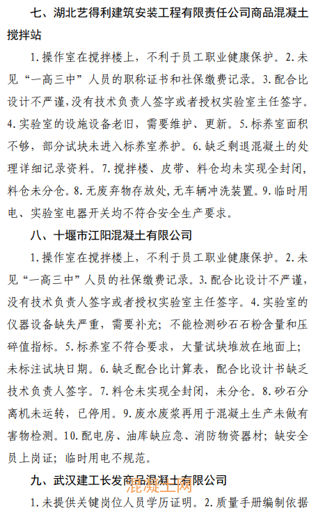 近日,湖北省住房和城鄉建設廳發布《關于2021年全省預拌混凝土(砂漿)企業日常管理及綠色生產巡查情況的通報》,此次共抽查了16個市州(神農架林區除外)87家混凝土(砂漿)企業(其中混凝土企業70家、砂漿企業17家)。