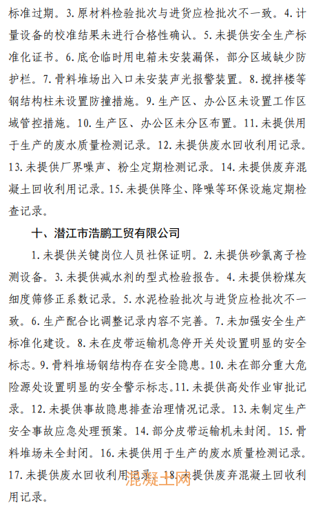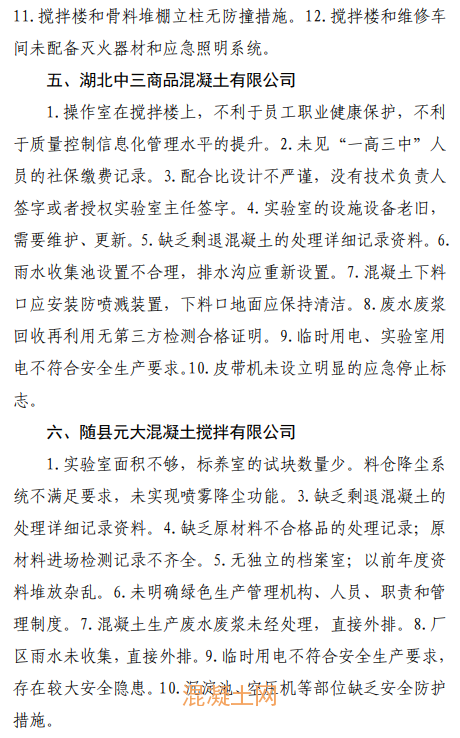 (二)綠色生產方面。少數企業降塵、降噪設備設施不完備,骨料倉、配料倉、皮帶輸送機、攪拌樓未實施全封閉,骨料堆場無降塵噴淋系統,無車輛沖洗裝置。部分企業廢漿處置不到位,砂石分離機未正常使用,固體廢棄物存放不規范,骨料露天堆放且無防塵措施,如鄂州中建商品混凝土有限公司骨料露天堆放,廢水(或廢漿)用于生產拌合水時,未進行檢測。