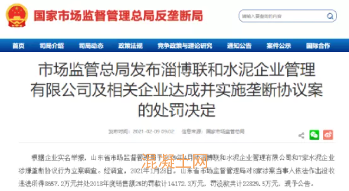 據(jù)了解,今年2月9日國(guó)家市場(chǎng)監(jiān)督管理總局反壟斷局發(fā)布淄博聯(lián)合水泥企業(yè)管理有限公司及相關(guān)企業(yè)達(dá)成并實(shí)施壟斷協(xié)議案的處罰決定。2021年1月28日,山東省市場(chǎng)監(jiān)督管理局對(duì)8家涉案當(dāng)事人依法作出沒收違法所得8657.2萬元并處2018年度銷售額2%的罰款計(jì)14172.3萬元,罰沒款共計(jì)22829.5萬元。