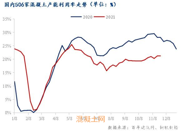 截至11月24日,我們跟蹤國內混凝土企業出貨情況,本周(11月18日-11月24日)國內500余家混凝土出貨量再度小幅下降,統計期內,混凝土平均產能利用率為21.15%,較上一周期(11月11日-11月17日)降低0.09%,較去年同期低6.95個百分點。調研期內部分地區部分地區冬季嚴寒天氣影響施工進度,混凝土生產受阻,而部分地區出現由于資金回籠問題較大,因此混凝土出貨心態謹慎;整體來看,今年臨近年末,多數工程并未如往年同期集中趕工,市場采購熱情較淡,因此混凝土產能利用率遠低于同期水平。
