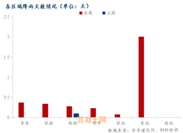 根據當周影響混凝土產量的降雨天數來看,本周影響混凝土出貨量的平均降雨天數不足1天。各地區近期受雨水天氣影響較小,攪拌站出貨情況本周與天氣因素關聯性不大。后期北方區域冬季低溫天氣到來后,會進入冬季停工狀態,因此全國工程進度會有所放緩,混凝土企業出貨量或下降趨勢為主。
