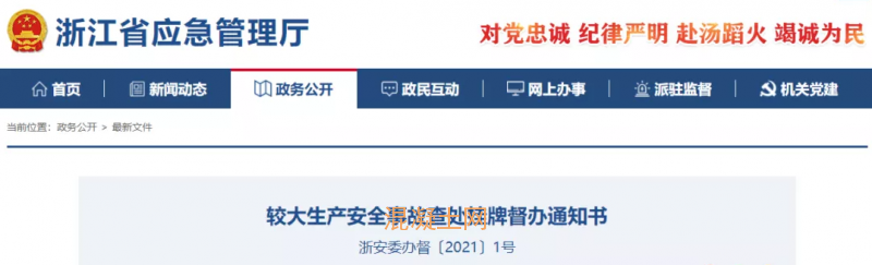 11月25日,浙江省應急管理廳發布一則《較大生產安全事故查處掛牌督辦通知書》,顯示: