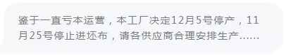 近日,某紡織廠發布通知表示:受各種因素影響,工廠一直虧本運營,決定于12月5日停產放假,直接停工到明年3月份!