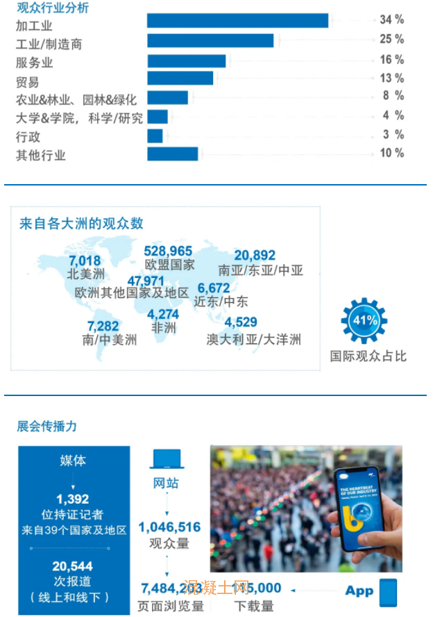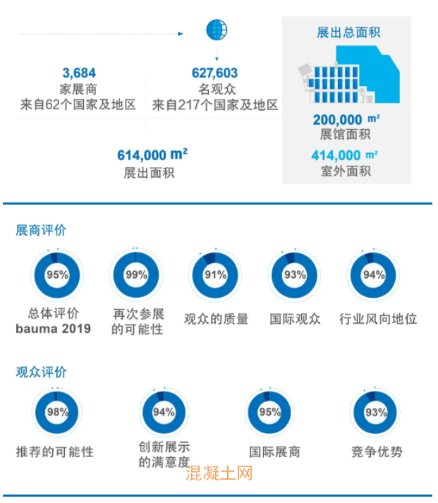 2019年,bauma展出總面積為614,000平方米,其中展館展出面積為200,000平方米,室外展出面積為414,000平方米。展會匯聚了來自62個國家及地區的3,684家展商參展,集中展示了工程機械、建材機械、礦山機械、工程車輛及建筑等方面的產品和行業前沿技術,展商滿意度高達95%。bauma無疑是中國工程機械企業進入國際市場的首選展會,是開拓海外市場的不二之選!